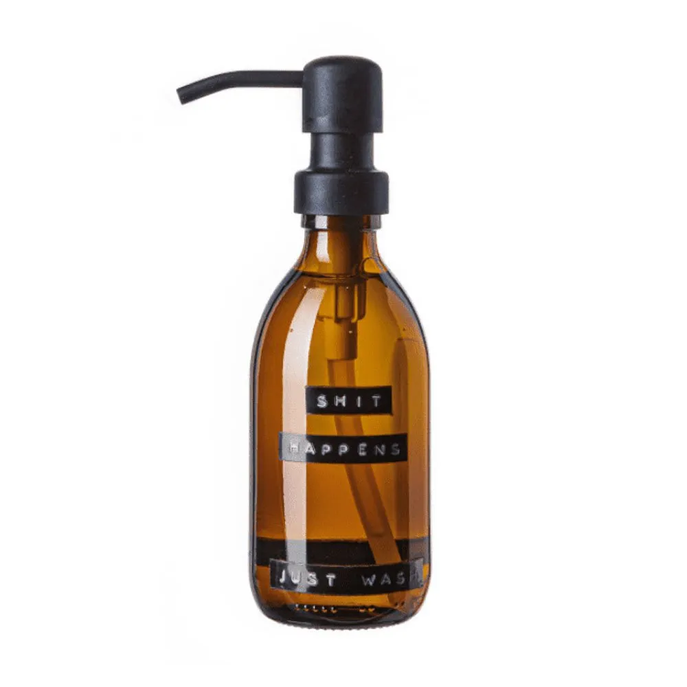 Wellmark Handzeep Bamboe Messing Pomp ‘Shit Happens’ 250 ml  – heerlijke verzorgende handzeep in een bruine glazen pompfles met een messing pomp. Deze fles bevat handzeep met de geur van bamboe.