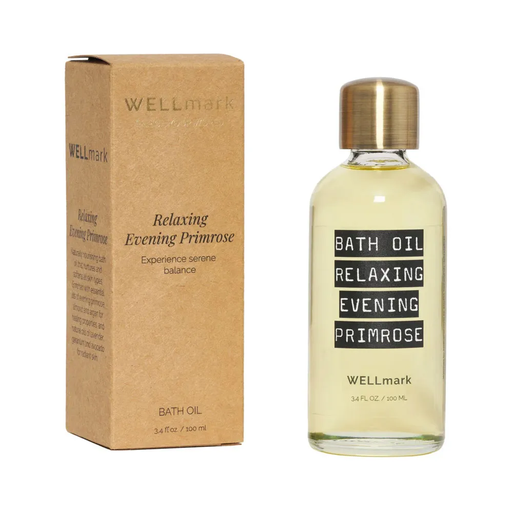 Wellmark Badolie Evening Primrose 100 ml – een heerlijke rustgevende en luxe badolie. De hydraterende ingrediënten in deze badolie komen van de teunisbloemolie, de zoete amandelolie, de avocado-olie en de arganolie. Teunisbloemolie bezit bovendien ook ontstekingsremmende eigenschappen. De lavendelolie heeft een ontspannende en kalmerende werking, en vermindert stress en angst. Als laatste zorgt de geraniumolie voor een gebalanceerde huid en een verfrissende geur. Kortom, een heerlijke badolie met actieve ingrediënten die bijdragen aan de verzorging van je huid en je geest.